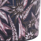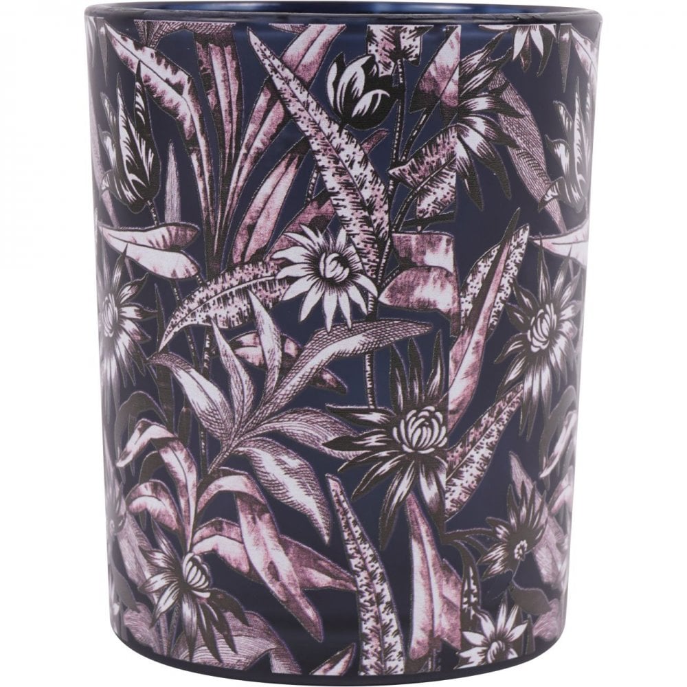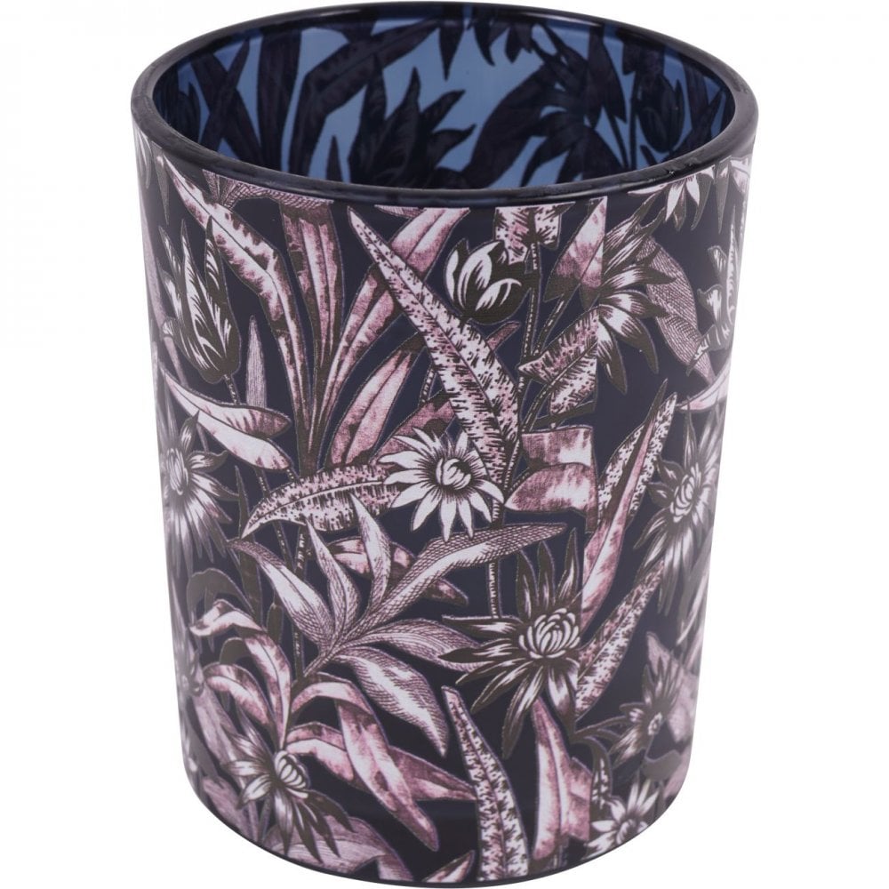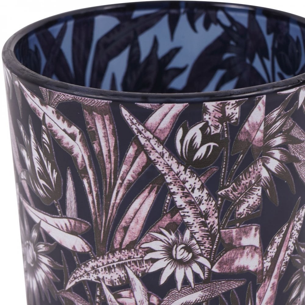 A tall glass hurricane featuring Laura Ashley’s moody Thistleton design on deep purple background, measuring 10 x 10 and 12 cm in height.