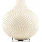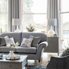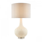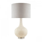 A delightful large table lamp, the bottle-shaped Grace from Laura Ashley has the look of opal glass (also known as milk glass), as the raised, ogee-patterned surface has been painted white. This lovely table light is accompanied by a grey linen cylinder shade and finished with bright polished nickel metalwork, including the round ring the base sits on.