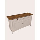 Expertly crafted from solid poplar with a reclaimed solid pine top, this stunning sideboard is painted in Laura Ashley Soft Truffle, complemented by a rich dark chestnut finish on the top. The reclaimed wood’s natural beauty shines through with its uneven edges, distinctive cracks, knots, and surface variations, bringing unique character and charm to your home.