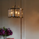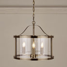 The clean-lined Laura Ashley Harrington ceiling pendant light is a graceful light is a graceful blend of clear glass and sleek metal. A simple, lantern-style drum-shaped case surrounds a suspended trio of lampholders, all in a vintage antique brass finish for effortlessly elegant looks. The 3 light Harrington ceiling pendant is a subtle yet stylish piece to illuminate your favourite room and create a bright, inviting space.
