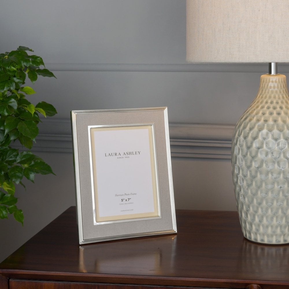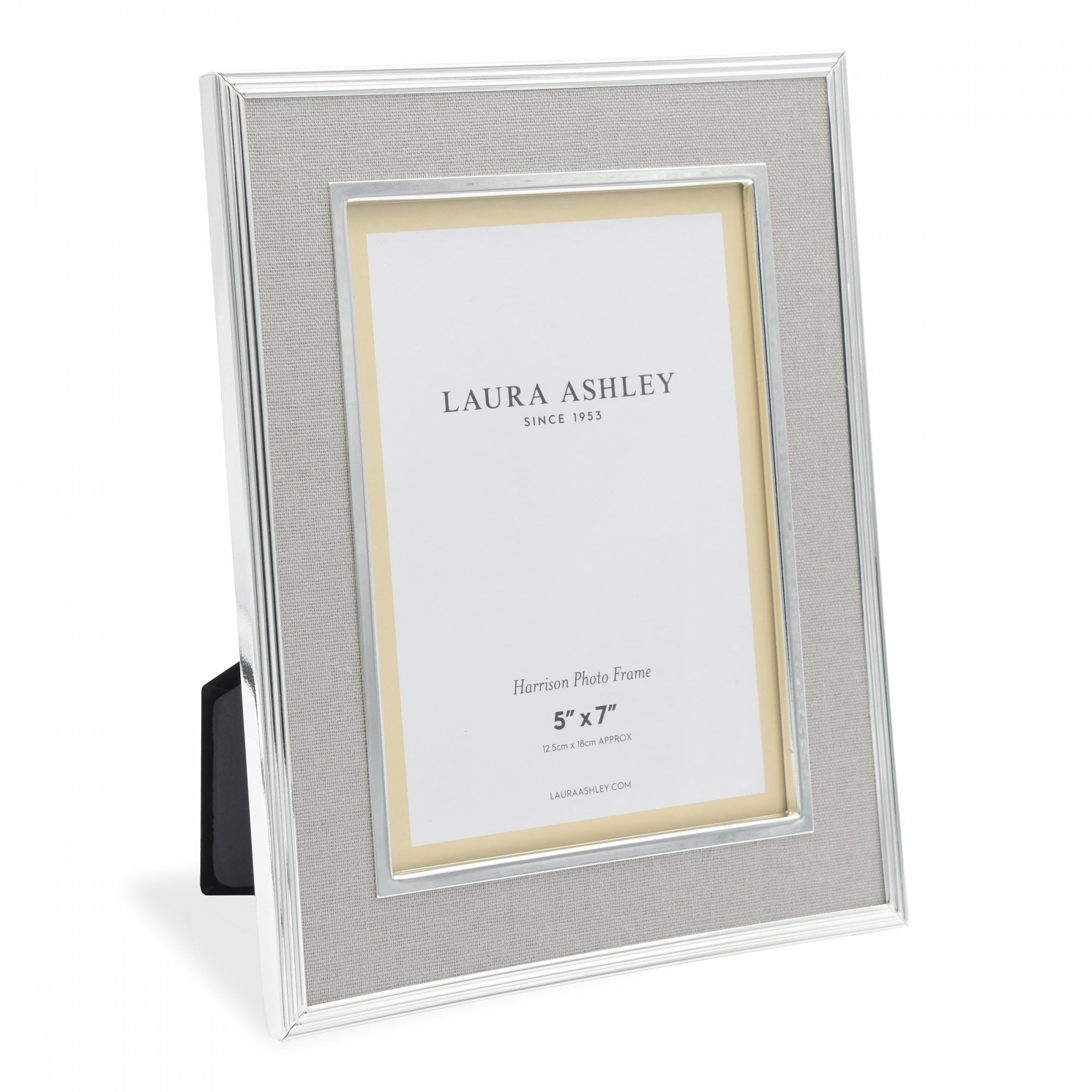 With a silver-plated metal frame faced in pale charcoal linen fabric and with raised beading, the elegant Harrison photograph frame from Laura Ashley is perfect for displaying your most treasured image. The understated opulence of this silver and grey photo frame will enhance any interior. Please note, the size refers to the size of the photo within the frame, which usually allows for an overlap of approximately 5mm.