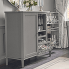Prepare to be impressed by the Laura Ashley Henshaw drinks cabinet, featuring stunning mirrored spaces throughout its interior. This remarkable piece offers a range of practical features, including an internal drawer, ample hanging space for glasses, a wooden rack with slide-out runners capable of holding twelve bottles, and storage racks fitted inside the doors. Crafted with care from solid oak and modern materials, the cabinet boasts a hand-painted finish with a clear lacquer for easy maintenance. It serves as a true statement piece, and you'll only need to attach the legs to begin enjoying this extraordinary cabinet—no full assembly required.