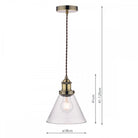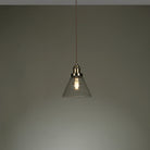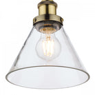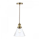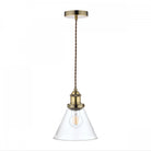 Laura Ashley's Isaac single light pendant fits effortlessly into kitchens and dens. Bold lines and angular shapes lend a sophisticated, contemporary touch that looks fantastic against bare brickwork. This contemporary hanging ceiling light boats industrial appeal with a warm antique brass finish and cone-shaped clear glass shape.