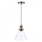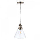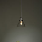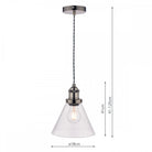 Laura Ashley's Isaac single light pendant fits effortlessly into kitchens and dens. Bold lines and angular shapes lend a sophisticated, contemporary touch that looks fantastic against bare brickwork. This contemporary hanging ceiling light boats industrial appeal with a satin nickel finish and cone-shaped clear glass shape.