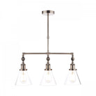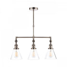 Laura Ashley's Isaac 3 light bar pendant fits effortlessly into kitchens and dens. Bold lines and angular shapes lend a sophisticated, contemporary touch that looks fantastic against bare brickwork. This contemporary hanging ceiling light boasts industrial appeal with a vintage industrial nickel finish and cone-shaped clear glass shades.