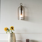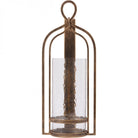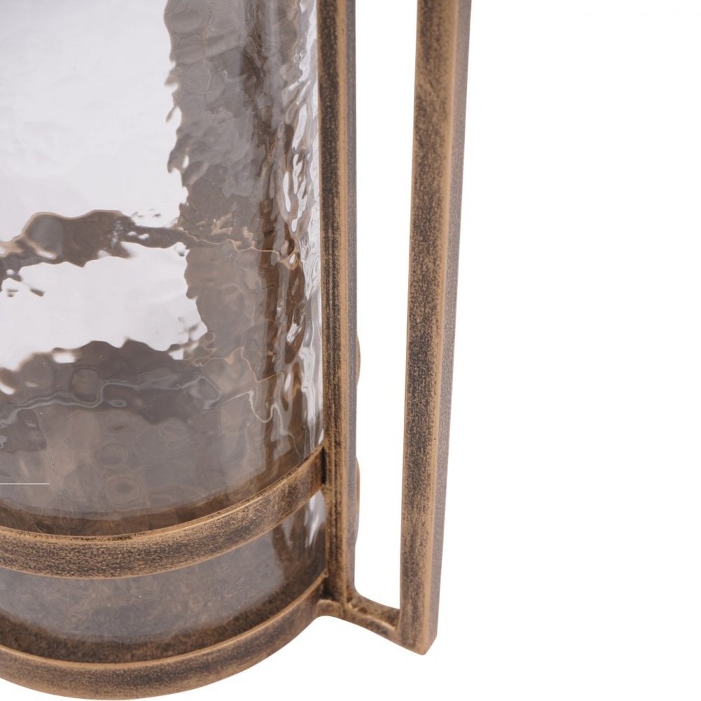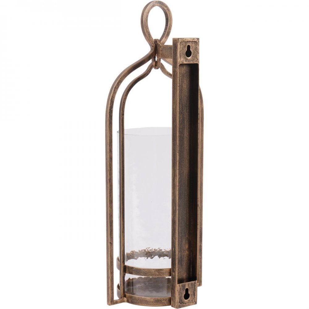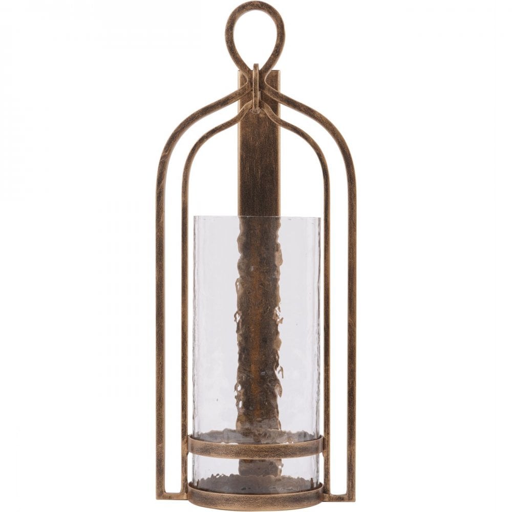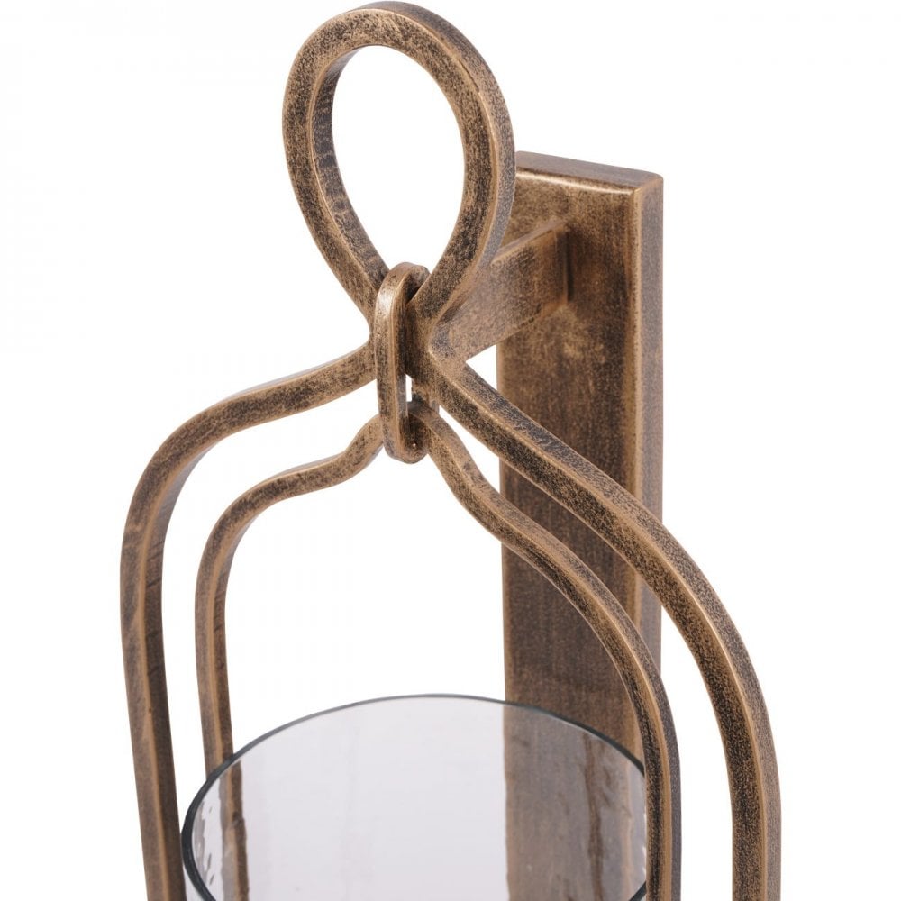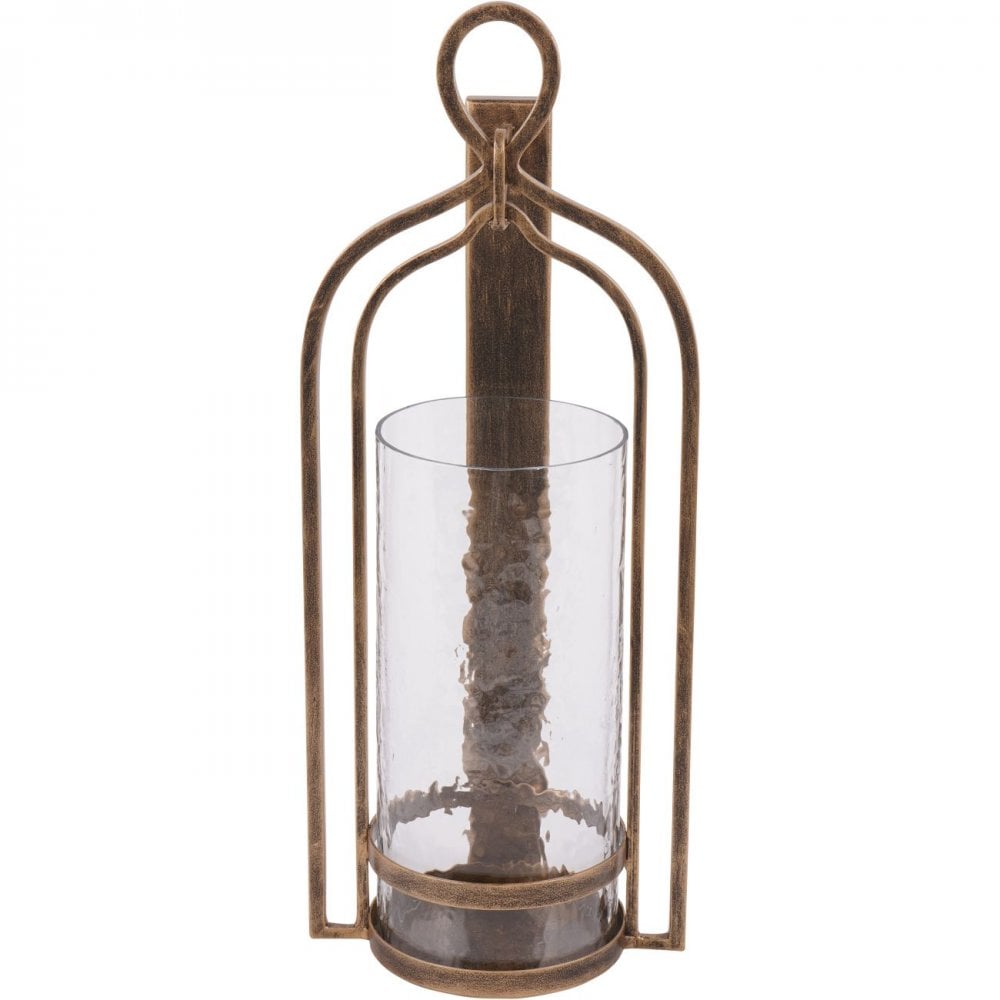 Aged champagne finish hurricane on iron featuring hammered glass which creates a beautiful effect. Part of the Loop candlelight collection. Wall fixings not included.
