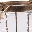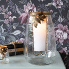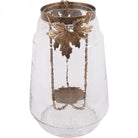Beautiful hammered glass hurricane decorated with delicate hand crafted Corrina leaves. Features an elegant 22 cm diameter suspended candle holder. Part of a wider Corrina leaf candlelight collection. The large measures 37 cm in height.