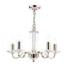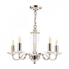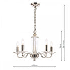 The Laura Ashley Carson 5-armed ceiling fitting is a beautifully crafted, candelabra style chandelier that makes a rather grand statement. Five arms in a vintage polished nickel finish curve out from the column-shaped body. Reminiscent of the shape of a slender classical vase, this centre piece is in clear, cut crystal, hand polished to give a smooth surface. The crystal is also used for the square candle dishes.