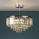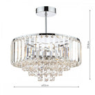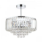 The glamorous Laura Ashley 3 light Vienna features bevelled glass 'coffin crystal' rods with a glittering fountain of square-cut faceted glass droplets that fall to a central point, all suspended from a circular frame in a polished chrome finish. Semi flush fittings are popular as they sit closer to the ceiling than a pendant so are suitable for lower ceilings and small rooms, plus they are more decorative and have a neater finish - there are no cables on show as the stem attaches directly to the ceiling rose.
