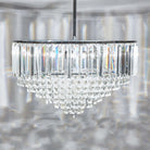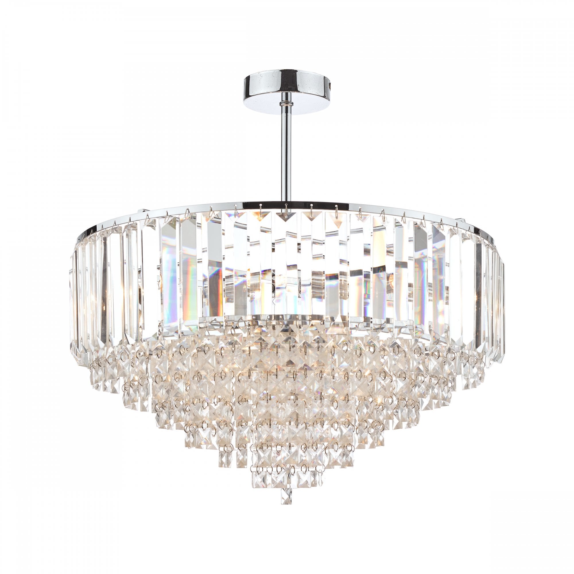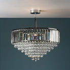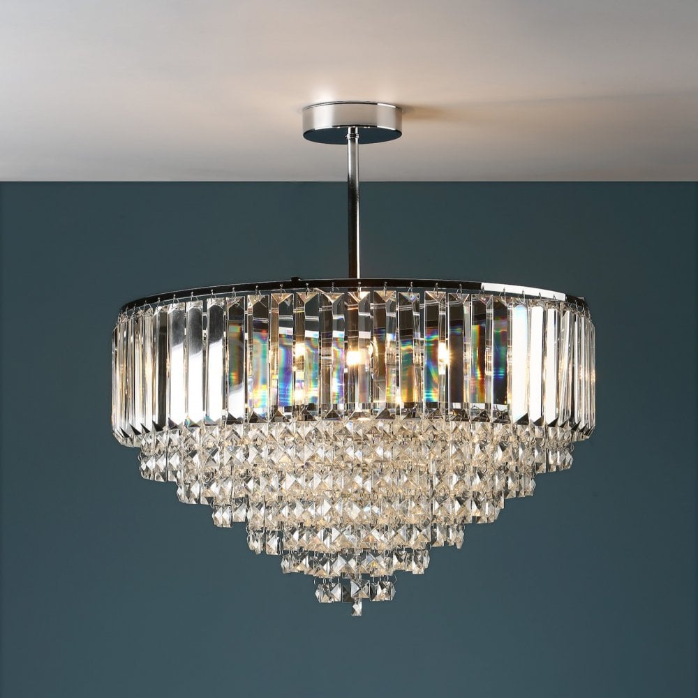 The glamorous Laura Ashley 5 light Vienna ceiling light features bevelled glass ‘coffin crystal’ rods with a glittering fountain of square-cut faceted glass droplets that fall to a central point, all suspended from a circular frame in a bright, polished chrome finish. Semi flush fittings are popular as they sit closer to the ceiling than a pendant so are suitable for lower ceilings and smaller rooms, plus they are more decorative and have a neater finish – there are no cables on show as the stem attaches directly to the ceiling rose.
