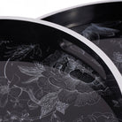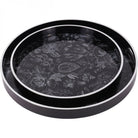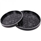 Set of two nesting trays featuring famous Laura Ashley Louise design set against a black background with white detailing on the tray edges. Part of a collection of tables, placemats, trays and coasters featuring the same design. Large 45W X 45D X 4H, Small 36W X 36D X 4H cm.