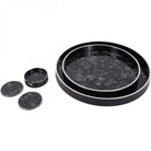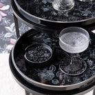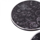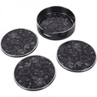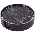 Set of four drinks coasters in matching holder featuring famous Laura Ashley floral design set against a black background. Part of a collection of tables, placemats, trays and coasters featuring the same design. Each coaster has gold edging and measures 10 x 10 cm.