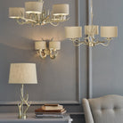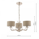Make a statement with the Laura Ashley Mulroy 3-armed ceiling fitting, a beautifully crafted, candelabra style chandelier that makes a rather grand, country house statement. Featuring a resin antler design, this contemporary interpretation of a nostalgic style boasts a hand-finished shimmering antique champagne look for a touch of luxury. Shades in a sheened, natural colour fabric are included.