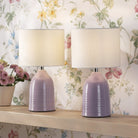 The Penny Table lamps from Laura Ashley are the perfect set for the bedroom, a long console or dresser. In a simple bottle shape, each lamp comes complete with a natural oatmeal linen shade. The Lavender glaze has a very subtle crackle glaze effect. With hand-carved horizontal ribbing, these versatile lamps can be used all around the home. Please note: This is a twin pack (these table lamps are not available individually). The Penny comes complete with a Ivory Linen Cylinder shade.