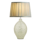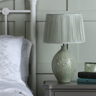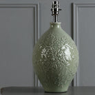 Designed especially for Laura Ashley, the Picardie table lamp is a complete lamp for upstairs as well as down. It features a beautiful hand carved, floral design taken from a wallpaper pattern in the Laura Ashley archive, which works well as a standalone design. This raised design is on a traditional and simple bottle shape base, with an aged-effect gloss crackle glaze in a soft and subtle green.