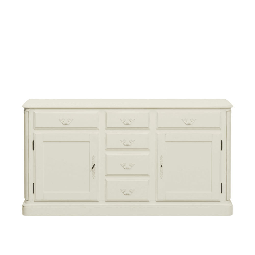 Both elegant and practical, the Laura Ashley Provencale 2 Door 6 Drawer Sideboard beautifully complements the other parts of the Provencale range and will make a statement in any dining space. Featuring an authentic arrangement of traditionally mounted drawers and doors using traditional hinges and locks; the piece provides a multitude of storage options for formal and casual dining alike. The surfaces are finished with a durable yet unassuming paint and a delicately applied patina to selected edges and profiles.