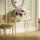 Pretty and delicate, the Laura Ashley Half Moon Console Table is equally at home against a wall or behind a mid-room sofa. Its slender legs echo those used for the other elements in the Provencale range but the pointe details in the tabletop provide an unexpected elegant feature. The surfaces are finished with a durable yet unassuming paint and a delicately applied patina to selected edges and profiles. Only the legs need to be attached to begin enjoying this piece; full assembly is not required.