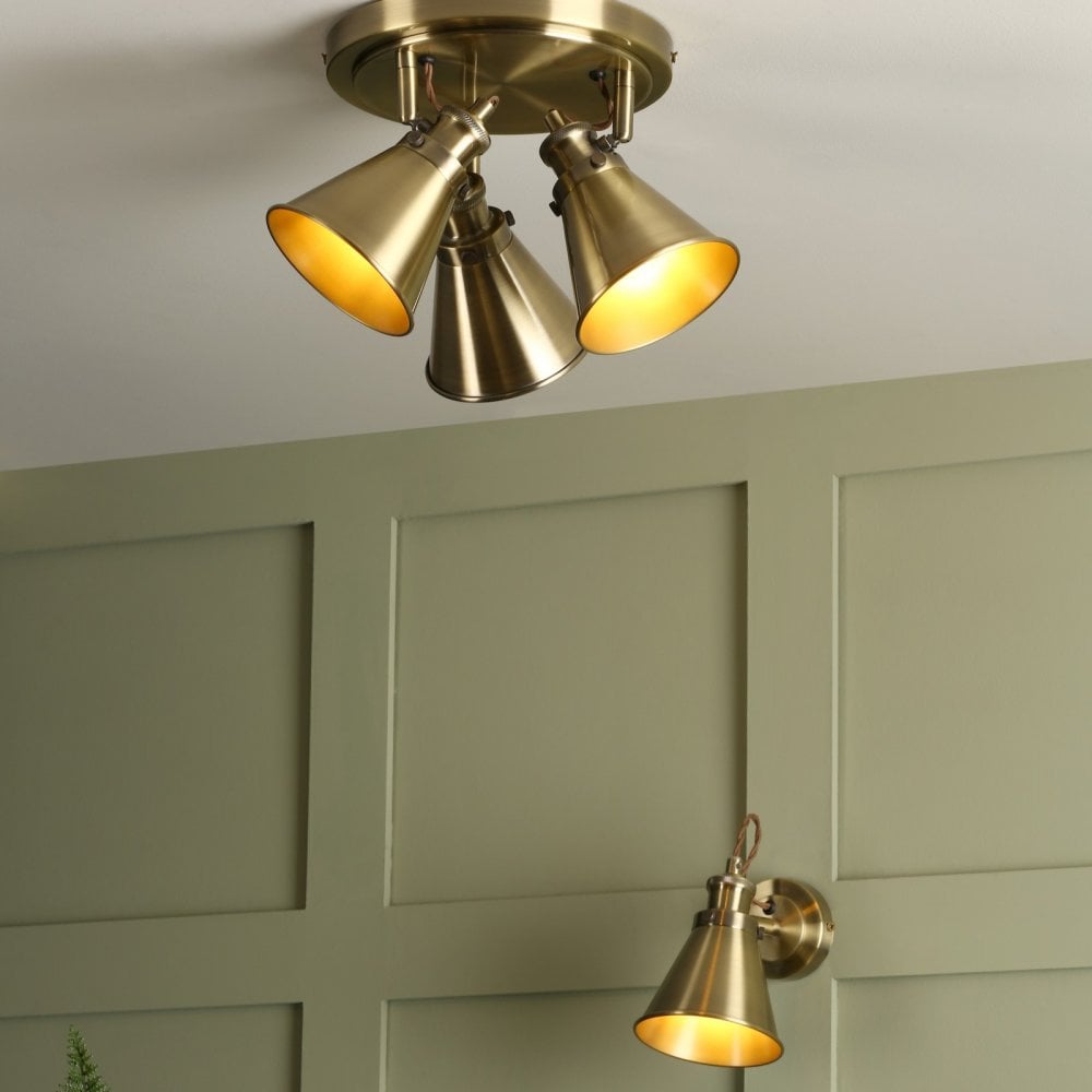 From Laura Ashley, the Rufus triple bar spotlight has a superior pewter finish that will look superb in your kitchen or dining room, with the lights angled precisely at your main work surface areas. This is a quality spotlight fitting with three cone shaded spotlights of spun metal with a neat rolled edge, on a slim, rectangular ceiling plate. The solid shades of the three adjustable spotlights can be tilted and turned to direct light exactly where you want it.