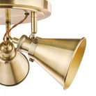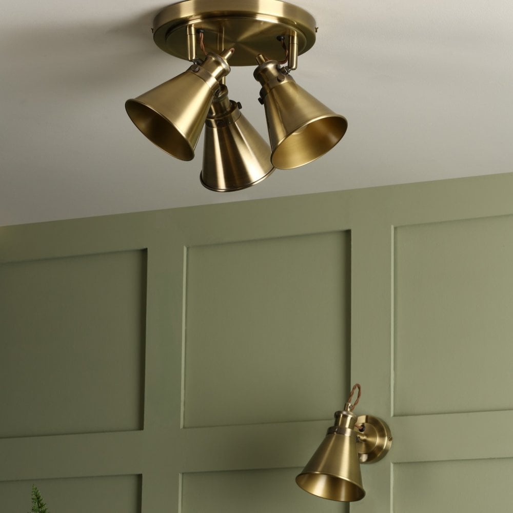 From iconic brand Laura Ashley, the Rufus triple bar spotlight has a superior antique brass finish that will look superb in your kitchen or dining room, above your main work surface area. This is a quality ceiling light with three cone shaded spotlights of spun metal with a neat rolled edge, on a neat, circular ceiling plate.