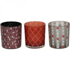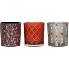 A set of three glass votive holders, with a mix of complementary designs. Measuring 7 cm in height.