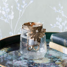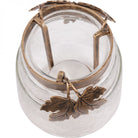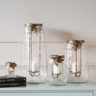 Beautiful hammered glass hurricane decorated with delicate hand crafted Corrina leaves. Features an elegant 10 cm diameter suspended candle holder. Part of a wider Corrina leaf candlelight collection. The small measures 12 cm in height.