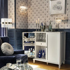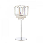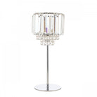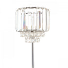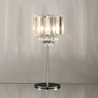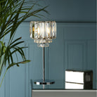 The glamorous Laura Ashley single light Vienna table light features bevelled glass ‘coffin crystal’ rods with a glittering fountain of square-cut faceted glass droplets that fall to a central point, all suspended from a double circular frame. The shade is supported on a straight stem rising up from a flat, round base. All the metalwork is finished in bright, polished chrome.