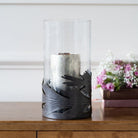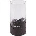 Laura Ashley Hurricane lantern featuring clear hammered glass drum entwined with delicate metal Winspear leaf in antique gold. Measuring 16cm diameter and 30cm in height.