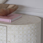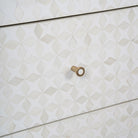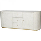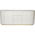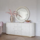 The Aspen Bone Inlay Two Door & Three Drawer Sideboard is an impressive oversized cabinet masterpiece that commands attention with its elegant curved edges. The two doors, positioned on either side of three drawers, are beautifully encased in a stunning bone inlay design. The cabinet rests on a contrasting antique brass plinth and each door conceals a fixed interior shelf for added practicality. The Aspen Sideboard blends intricate Indian handicraft with functionality, keeping this traditional decorative art technique alive. The Aspen collection includes a Two Door Bar Cabinet and round Mirror.