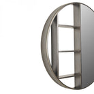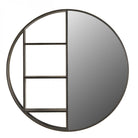 The Belvedere Wall Shelving Mirror Small offers a compact expression of sculptural utility. Crafted from iron in a deep gilded dark bronze finish, the circular frame is divided between mirrored glass and open shelving, balancing practical storage with reflective surface. Its corrugated outer edge brings tactile interest while the metallic tone adds depth and warmth.