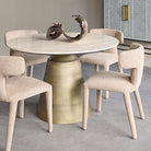 Clifton II Light Travertine Round Dining Table pairs a smooth travertine top with a conical antique brass base for a timeless, contemporary feel. Beautiful natural travertine is filled with resin then set upon a cast aluminium brass finish base. Table seats four people. A natural companion to other pieces in the Clifton II collection, including the Coffee Tables (60cm & 75cm) and Side Tables (40cm in both Light Travertine and Dark Travertine finishes). This versatile centrepiece completes the look with refined coordination and material harmony.
