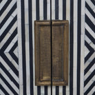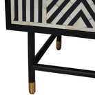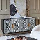 The Delaney Four Door Buffet Cabinet showcases exquisite hand-crafted bone inlay in a bold geometric pattern, set within a rich black wood frame. Antique brass-finish handles, and slim brass-capped legs provide elegant contrast and refinement. Behind the four doors, spacious shelving offers versatile storage for dining or living spaces. Pair it with the matching Delaney Drinks Cabinet for a coordinated and visually striking interior scheme. Dimensions: 150 x 40 x 80 cm. Includes two removable shelves with 25cm and 30cm clearance.