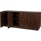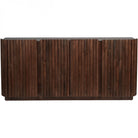 The Monterey Wooden Four Door Sideboard is a striking and sophisticated cabinet, floating on a sleek, wooden plinth. It features intricately carved ridged lines with soft, rounded contours, crafted to enhance the wraparound design. Handmade from solid mango wood with a dark stained finish and a smooth wooden top. The spacious interior includes a fixed shelf, offering generous storage, while the door are handleless to continue the modern, streamlined aesthetic. This Sideboard is a wonderful addition to our Monterey collection.