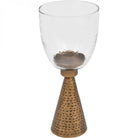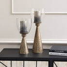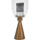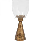 Hammered in antique gold with a smooth clear glass hurricane, perfect for a 75mm candle – this metallic design is a contemporary twist that takes inspiration from Industrial trends and manufacturing. Simple self assembly is required. Please note, hurricane will align correctly when assembled. Candle not included.