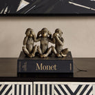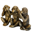 This characterful sculpture reimagines the well-known proverb in richly detailed, textured form. Cast from a considered blend of polyresin and limestone, the trio of seated monkeys is finished in antique gold, revealing a subtly distressed patina that draws out the intricacies of their fur and expression. Each figure captures a moment of silent symbolism with eyes covered, ears closed, and mouth concealed, adding narrative charm and visual rhythm. Compact yet expressive, it makes an ideal feature for shelves, consoles, or layered decorative groupings.