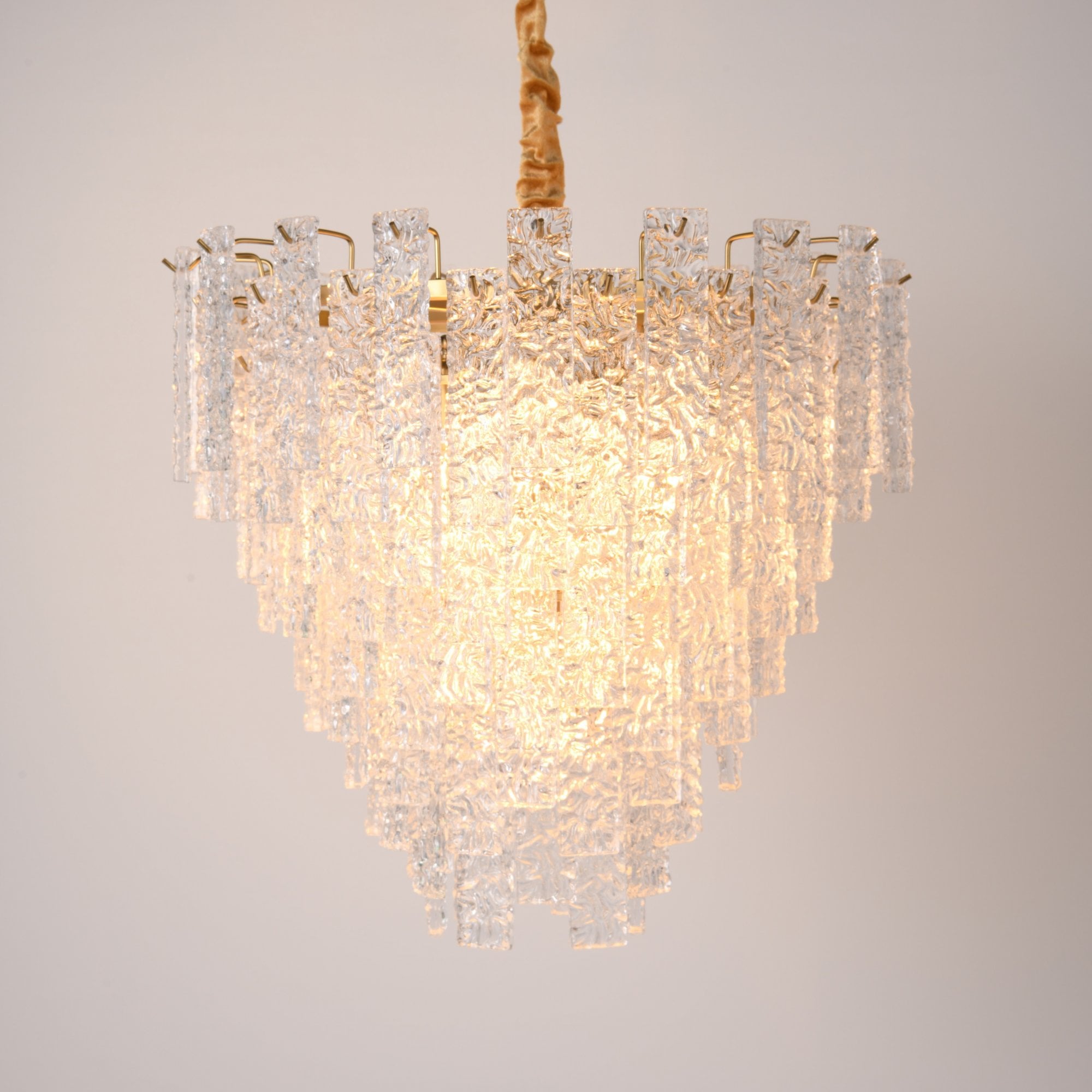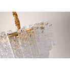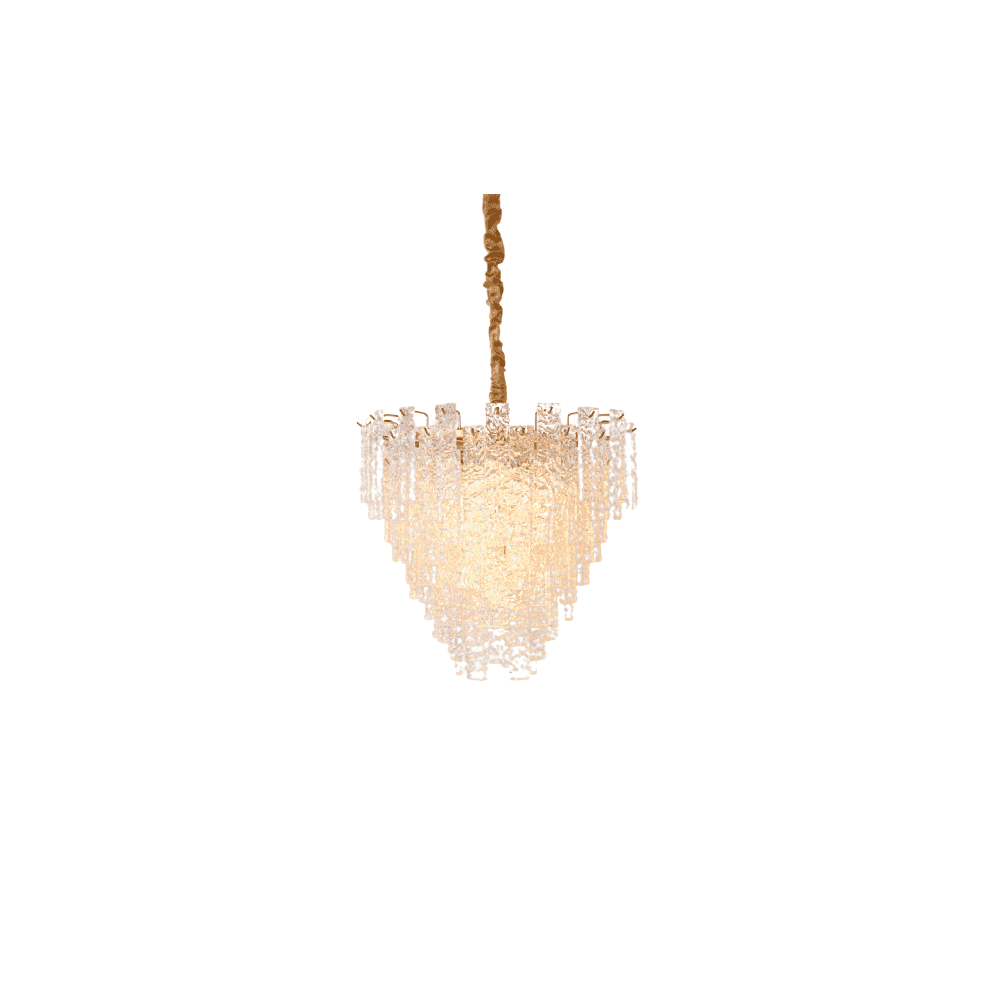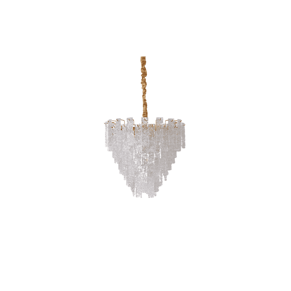 The Kira gold hand blown glass chandelier featured an antique brass finish and glass shards that sparkle in the light. This chandelier has a glamourous look and is suited to an interior where a statement light is required.