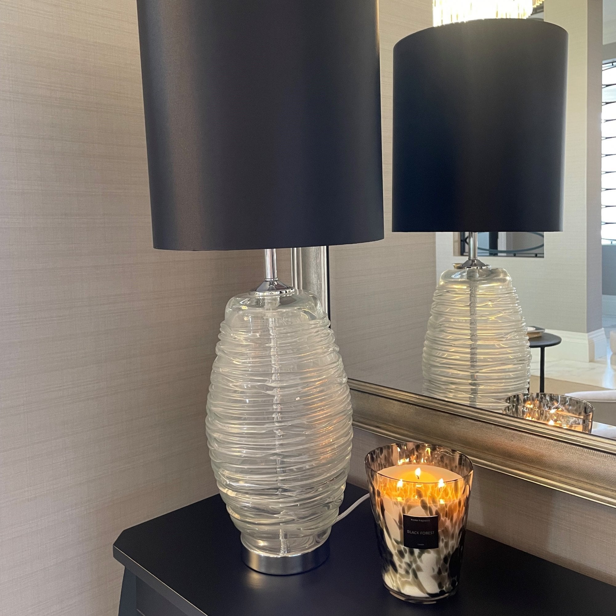 A stunning super chunky, heavy hand blown clear glass table lamp with Polished Chrome detail and Black Satin fabric shade. The glass ahs a swirl detail and a chunky base for a quality look.