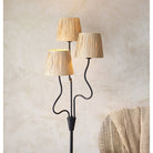 Add a playful style to your interior with this unique wriggle shaped 3 arm floor light, complete with wrapped raffia shades and finished in matt black, with in-line foot switch. Matching wall light, table light and pendant also available.