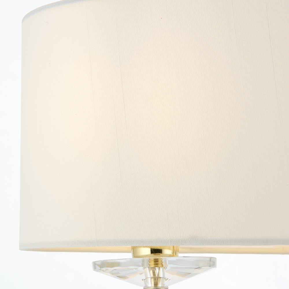 A 2 light table light finished in a brass effect plate with a vintage white silk shade and crystal glass detailing. suitable for use with LED lamps and supplied with an inline switch.