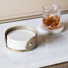 Elegant White Banswara marble brings a fresh, luminous quality to our Belvedere Aged Gold set of four coasters, each featuring subtle grey veining unique to the stone. The matching holder, finished in champagne gold with a corrugated edge, adds warmth and texture to the design. A Libra exclusive, our coasters are suited to both casual and formal settings.