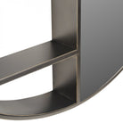 The Belvedere Wall Shelving Mirror Small offers a compact expression of sculptural utility. Crafted from iron in a deep gilded dark bronze finish, the circular frame is divided between mirrored glass and open shelving, balancing practical storage with reflective surface. Its corrugated outer edge brings tactile interest while the metallic tone adds depth and warmth.