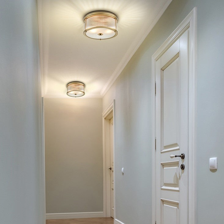 Aged brass finish flush ceiling fitting with ribbed glass and a frosted glass base.