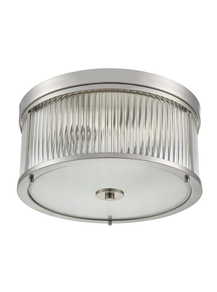 Satin nickel finish flush ceiling fitting with ribbed glass and a frosted glass base.
