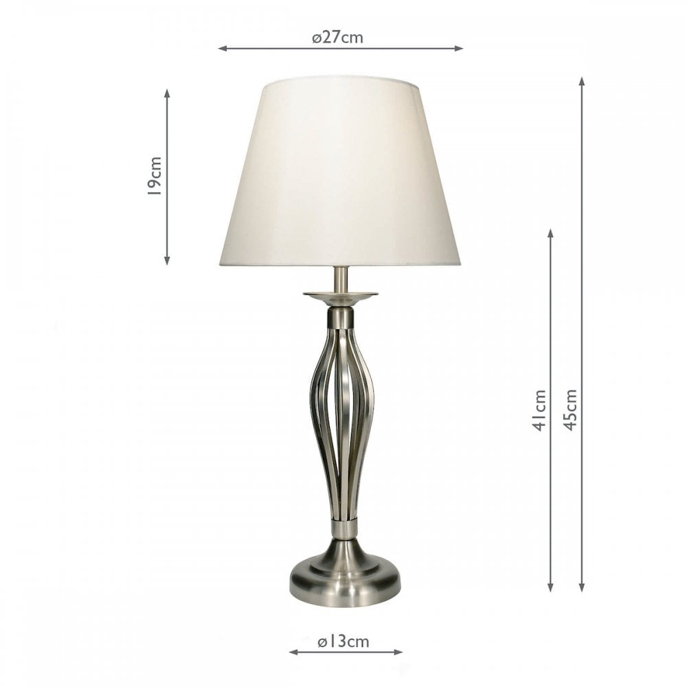 The Bybliss Table Lamp has a satin chrome base with open metal work decoration and cream shade. The Table lamp is in line rocker switched. Sold as a pack of 4. 4 x E27/ES bulbs required.