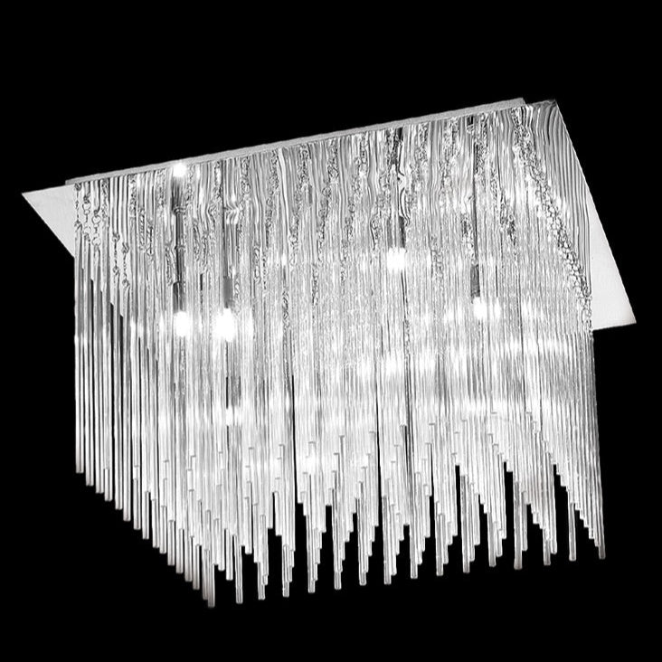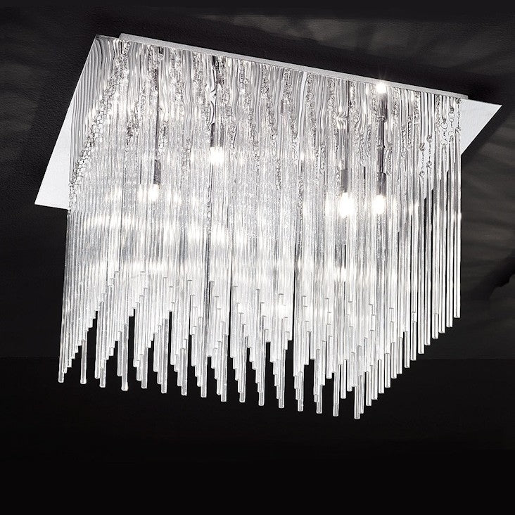 Smooth glass rods suspended from a chrome finish ceiling plate. LED G9 lamps should be used. Suitability for dimming will depend both on the lamp and switch used.