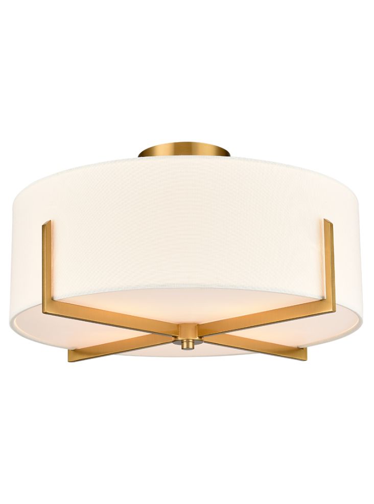 Cream textured fabric shade nestled within an aged brass finish flush fitting.
