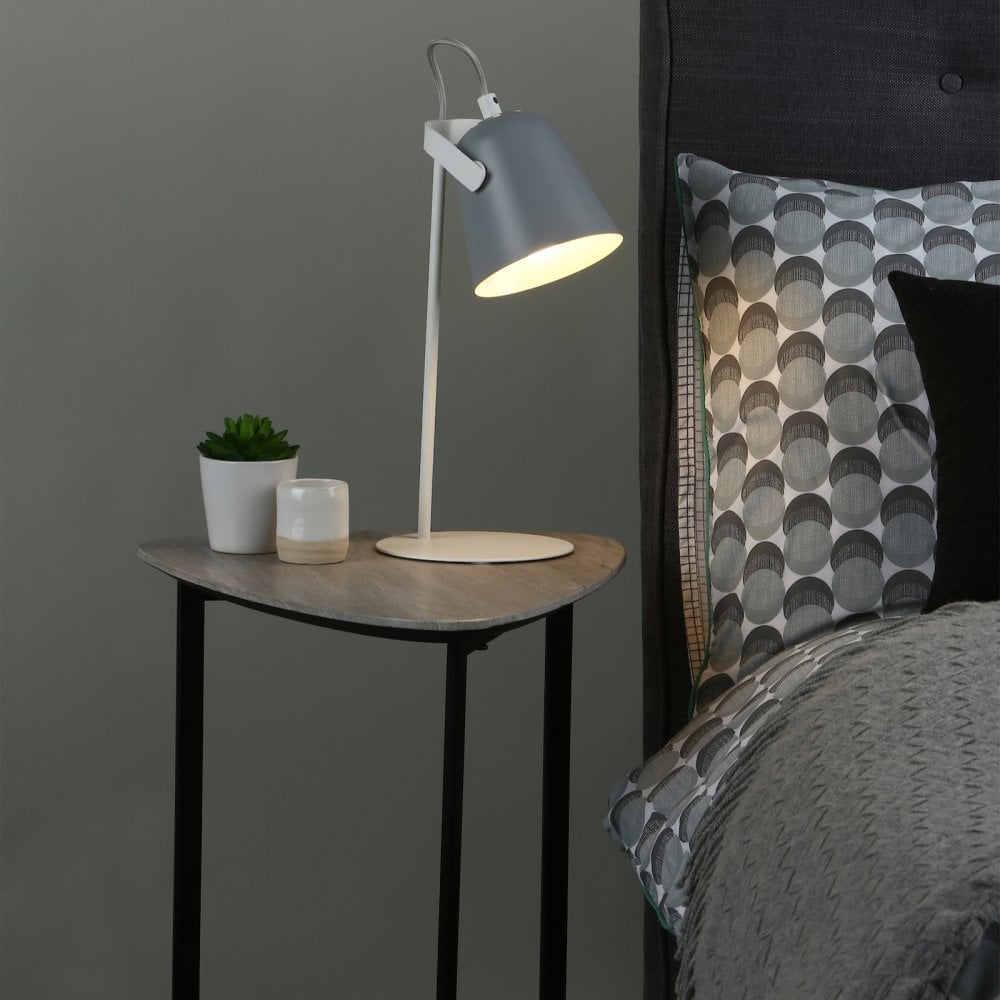 Effie - compact task lamp with an adjustable head in matt white with a pale grey shade and luxury braided cable this versatile light adds a splash of colour and Nordic style to any desk.