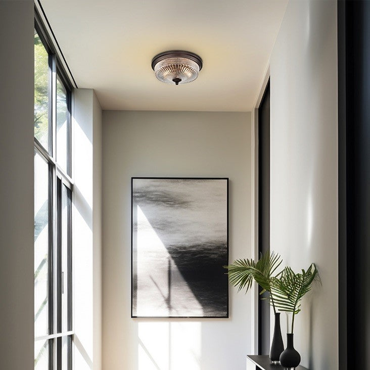 A dark brown finish flush ceiling fitting with decorative clear ribbed glass.