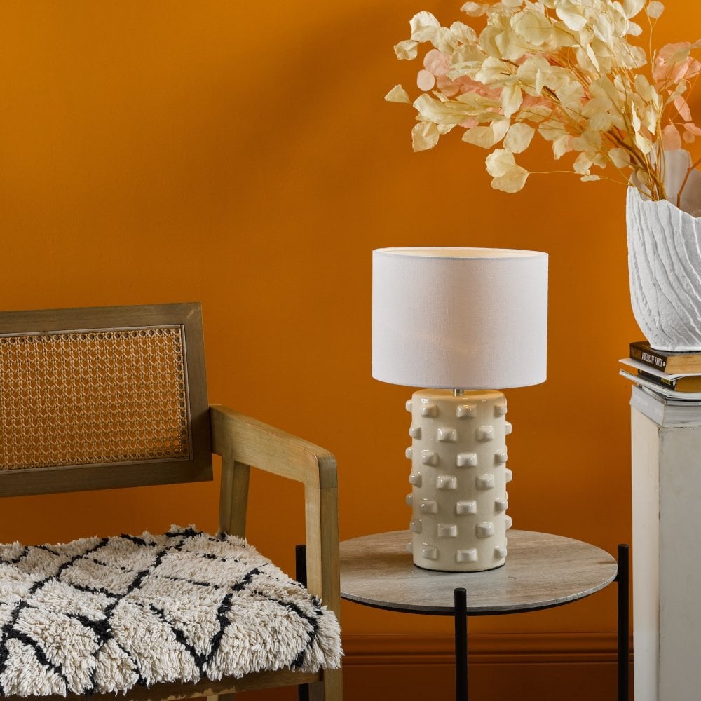 The Georgina Table Lamp White is a modern take on a classic design. Our designers were inspired by mid-century sculpture for this refined yet striking table lamp. The white ceramic base features a gloss glaze, while the matching ivory linen drum shade adds a touch of cosy comfort. An inline rocker switch mounted on the white braided cable allows easy operation. Whether reading, relaxing or entertaining, this lamp casts a beautiful ambient light. Its modern refined style will add a touch of contemporary class to any space. Whether on a side table, console or bookshelf, this lamp is sure to become a much-loved favourite.