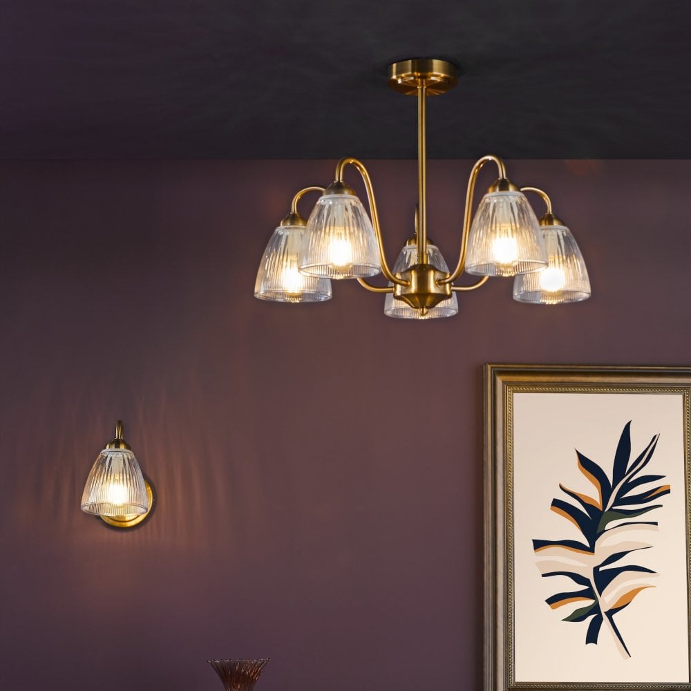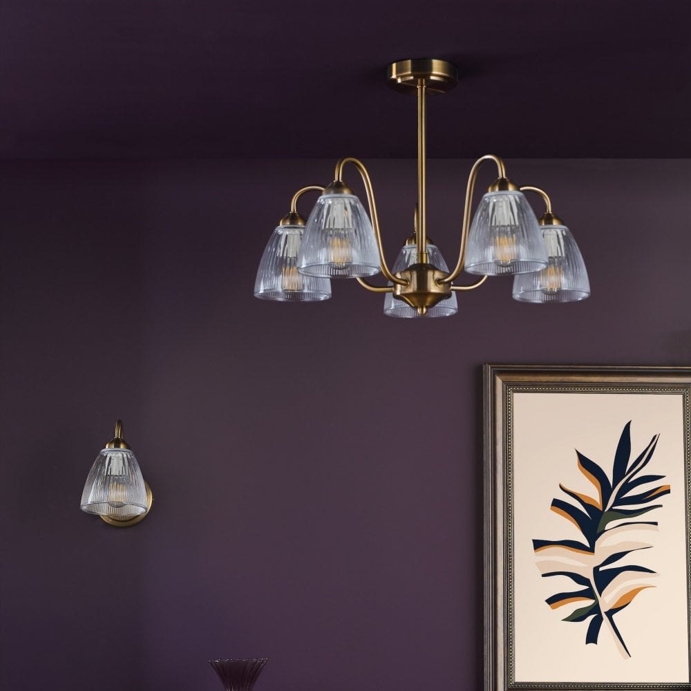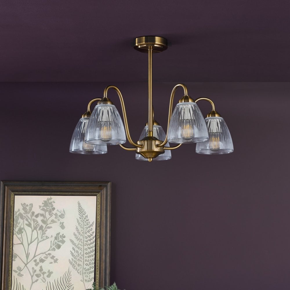 Illuminate your space with the Glynis 5 Light Semi-Flush ceiling light from dar lighting, a perfect solution for lighting low ceilings. This traditional-style fixture boasts a warm antiqued bronze finish and clear ribbed glass shades, adding texture and visual interest to any room. The Glynis semi flush ceiling light creates a cosy ambience whilst providing ample illumination for your living areas. For those preferring a more contemporary look, a nickel finish option is available. Versatile in design, this light complements various home decor styles, from classic to modern. Complete your lighting scheme with matching wall and table lamps, available separately. Whether you're reading, relaxing, or entertaining, the Glynis ceiling light sets the perfect mood for any occasion.