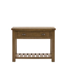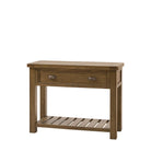 Add timeless charm to your home with this beautifully crafted console table. Featuring a spacious top, a large practical drawer with classic metal handles, and a slatted lower shelf, this console table offers ample storage and display opportunities, making it perfect for living spaces, hallways, kitchens and more The warm wood finish made from oak wood solids & veneers highlights natural grain, complementing the classical design and creating an inviting focal point for any home.